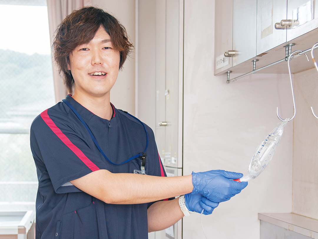 私は急性期の病院で勤務した後、当院の療養病棟で勤務しています。療養病棟では、急性期を脱して全身管理、長期療養が必要な患者様がほとんどです。持続点滴・経管栄養などの医療管理から、おむつ交換、食事・入浴介助などの日常的なケアが中心です。長い入院生活の中で、患者様一人一人と深く関わる事ができ、信頼関係を築いていけるという部分に魅力を感じています。